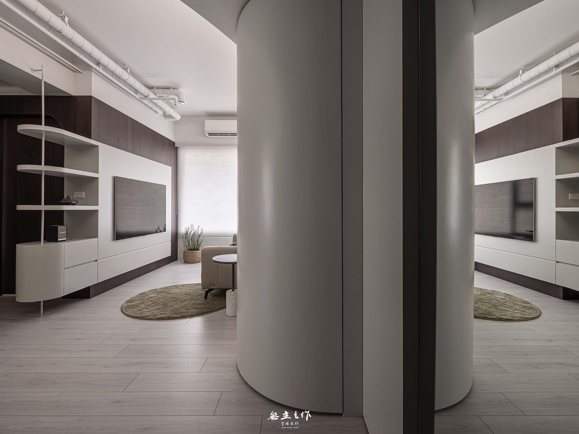 依循光線的引導,翻轉房屋分向分離的架構,將原本L行的空間藉由弧形軸線串起,書房工作區與客廳休憩區各居一方,保持工作與生活的適當距離,在弧形軸線的主要動線上穿插生活收納機能,依收納物品的使用頻率而選擇規劃在休憩區或工作區或中介區,引導屋主駐足停留在房子的每一處細細品嘗。